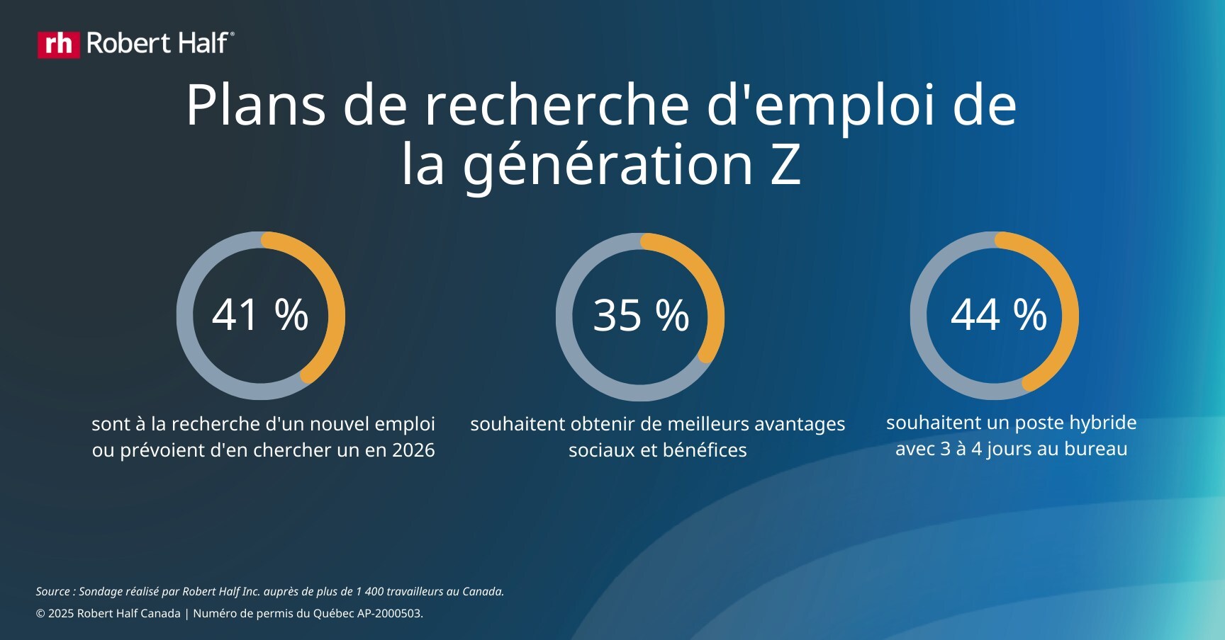 « De nombreux professionnels ont renoncé à changer d'emploi en 2025 en raison de l'incertitude économique et globale, mais des signes d'une plus grande mobilité apparaissent à l'aube de 2026. Les travailleurs soulignent une fois de plus l'importance qu'ils accordent aux avantages sociaux tels que la flexibilité, les salaires concurrentiels et le développement professionnel : ils se sentent moins enclins que l'année dernière à rester dans des entreprises qui ne leur offrent pas ces éléments essentiels. », déclare Koula Vasilopoulos, directrice générale principale chez Robert Half, Canada.