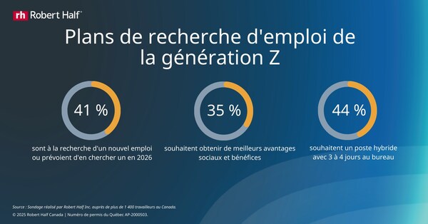TORONTO, le 11 déc. 2025 /CNW/ - Selon une nouvelle étude menée par Robert Half, cabinet spécialisé dans les solutions de gestion des talents et les services-conseils d'affaires, l'optimisme en matière d'emploi commence à montrer des signes de reprise en 2026, avec un nombre croissant de professionnels recherchant activement un changement de carrière. Le sondage a révélé que 33 % des professionnels canadiens ayant un emploi prévoient de chercher un nouvel emploi au cours du premier semestre de l'année, comparativement à 26 % en juillet 2025.